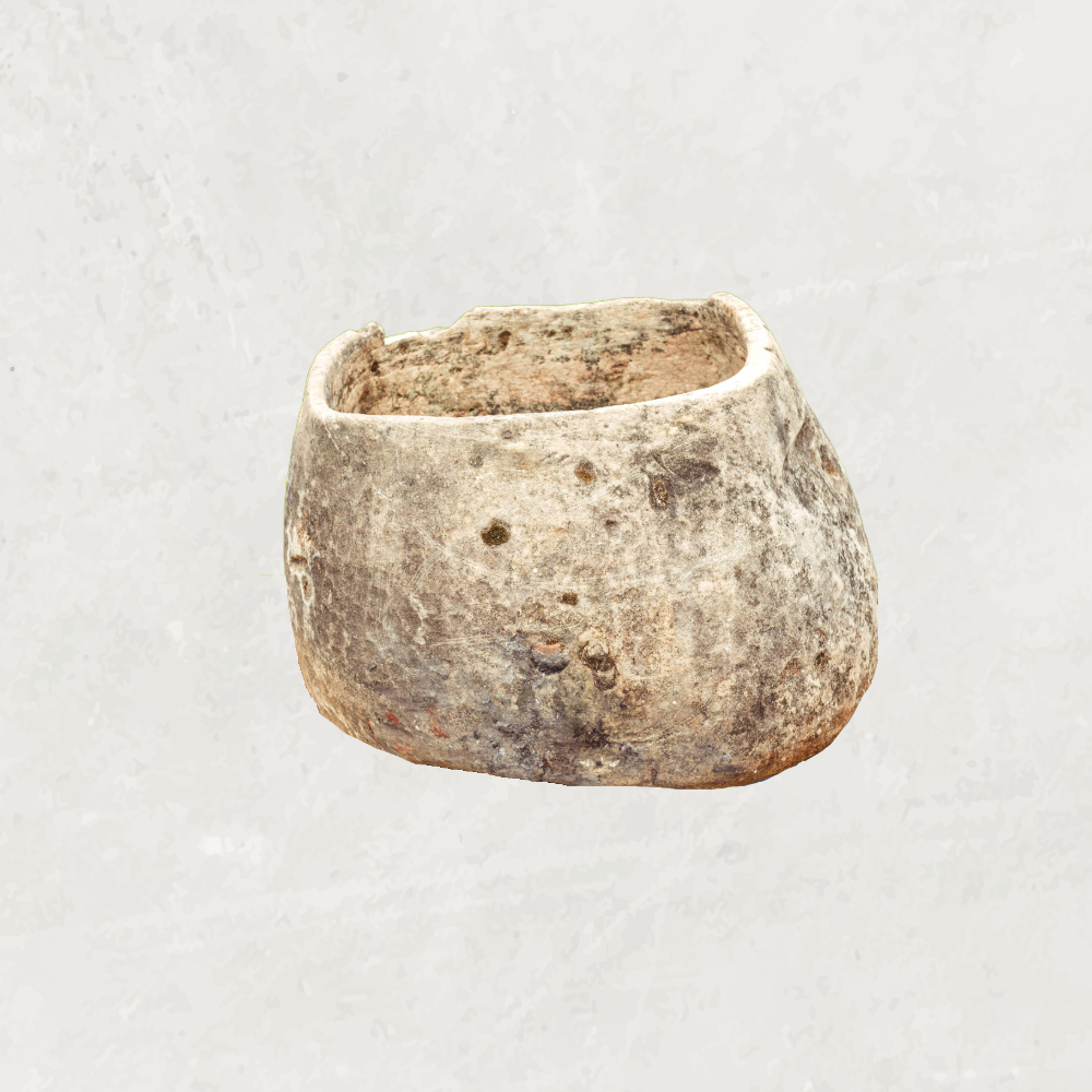 Bijzondere organische natuurstenen pot in licht beige/grijs met een bijzondere patina. De pot loopt subtiel taps toe en heeft dunne, verfijnde randen. Uniek model!